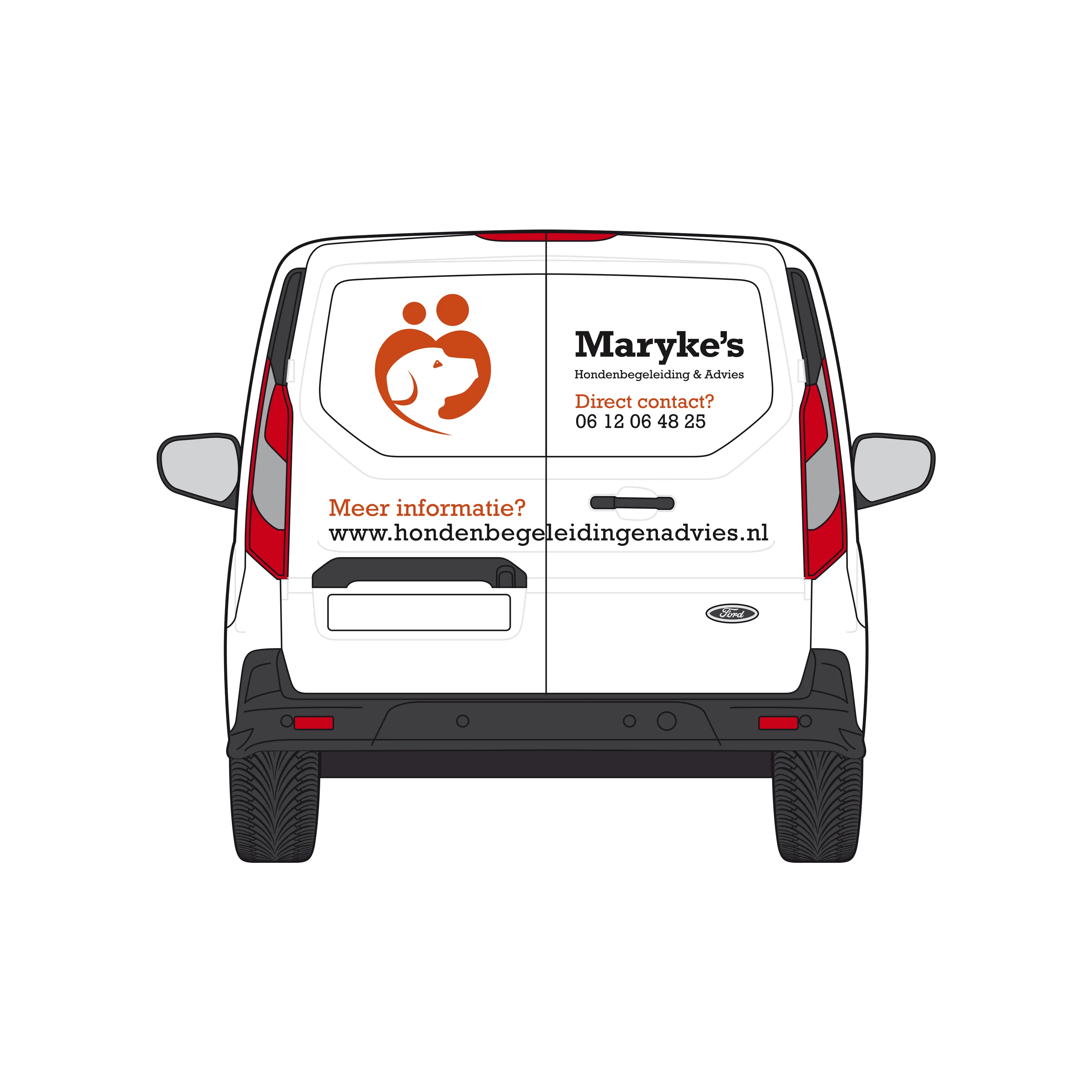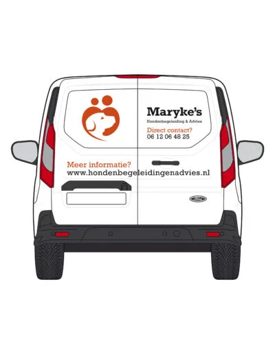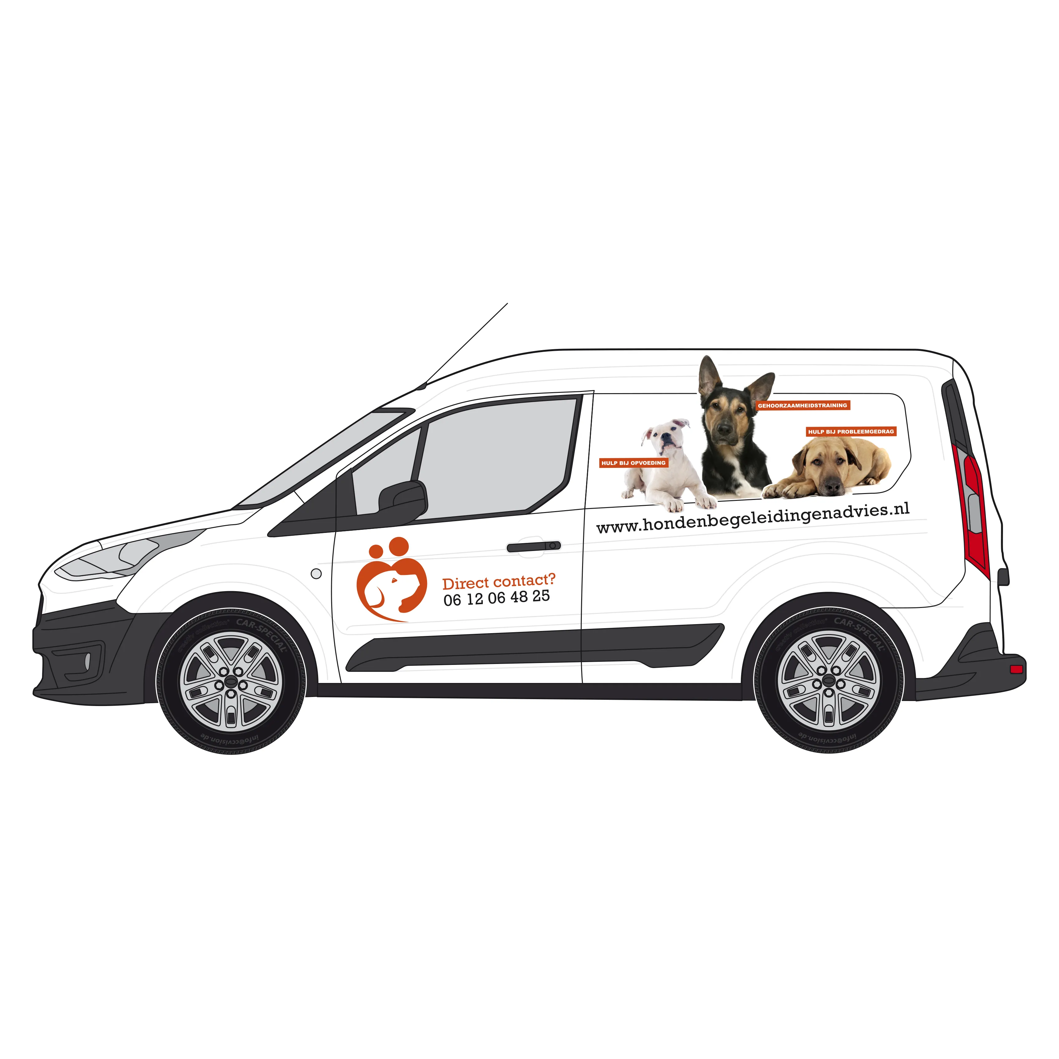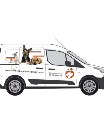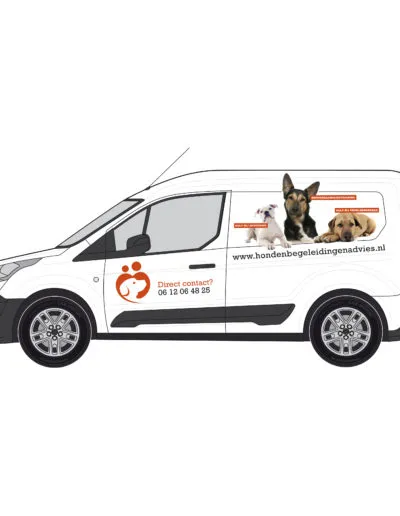 Maryke Barendregt is voortaan duidelijk herkenbaar op weg met haar bedrijfswagen. Zij vroeg ons niet alleen een beletteringontwerp te maken voor haar nieuwe auto maar ook de belettering te verzorgen, dat doen we natuurlijk graag! Meer weten over wat Maryke voor u en uw hond(en) kan betekenen? Bekijk dan haar website www.hondenbegeleidingenadvies.nl