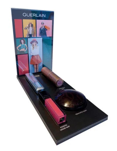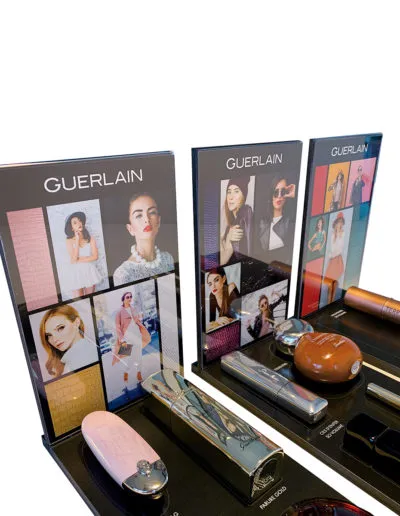 Het is natuurlijk zonde om display’s na (kort) gebruik weg te gooien. Daarom vroeg GUERLAIN ons om een wisseldisplay te maken. De basis van deze display’s zijn herbruikbaar. De ingestoken visuals zijn eenvoudig te verwijderen en te vervangen voor een set nieuwe visuals. Zo heeft men simpel en snel weer actuele display’s. Wil jij ook een display laten maken? Neem contact met ons op!