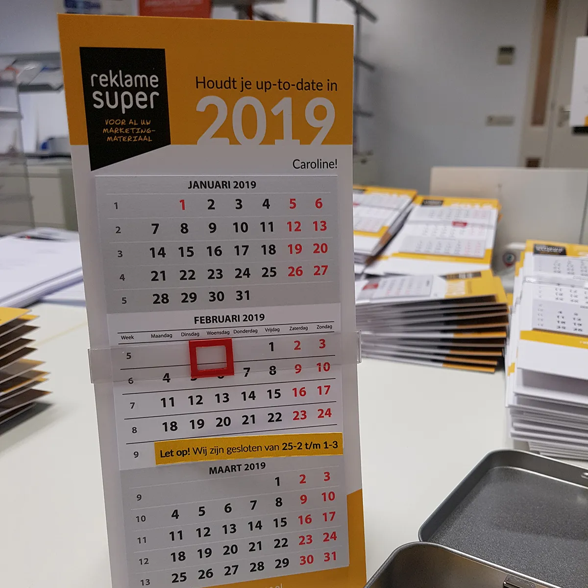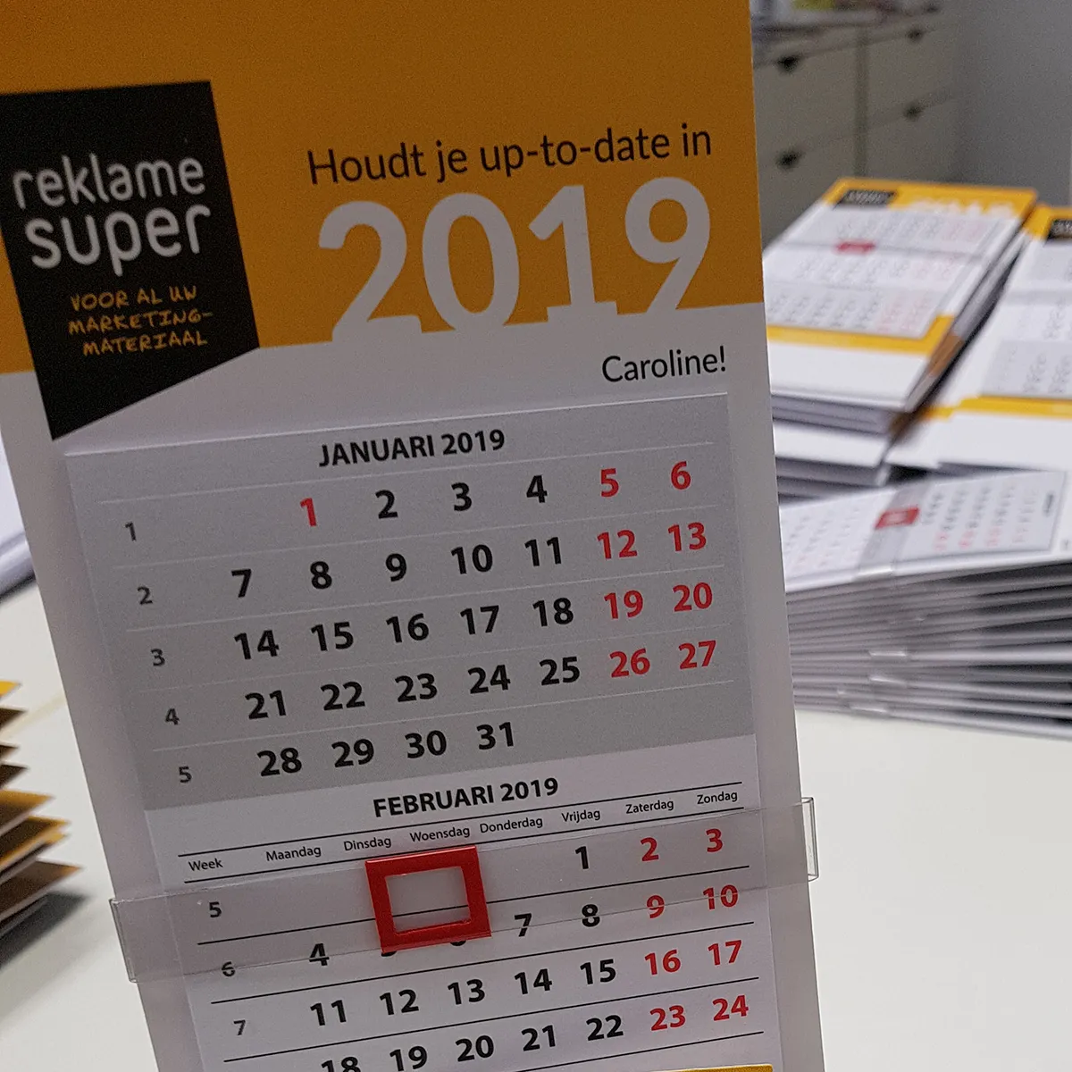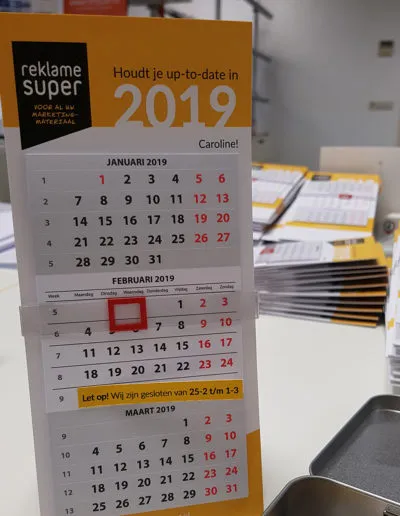 Elk jaar ontvangen al onze klanten hun eigen kalender, deze zijn dus ook op naam! Zo heeft iedereen haar of zijn eigen Reklamesuper kalender die het gehele jaar op het bureau kan staan, super handig! Er zijn zelfs klanten die er in december al om vragen. Dit jaar is de kalender voorzien van een extra melding: