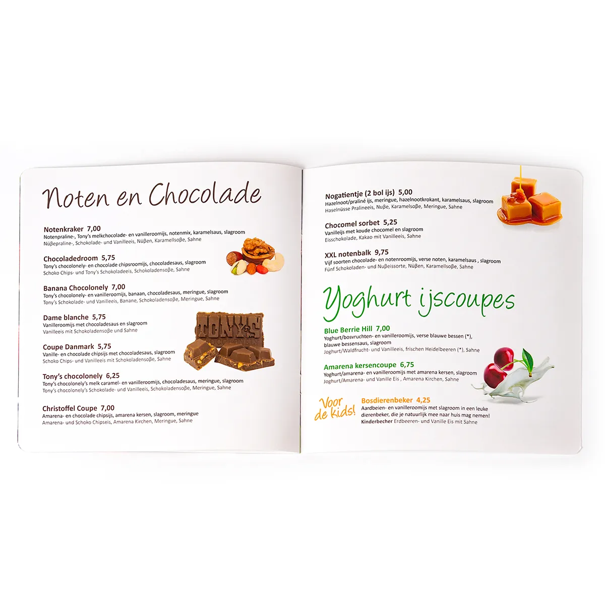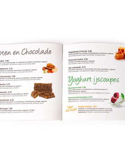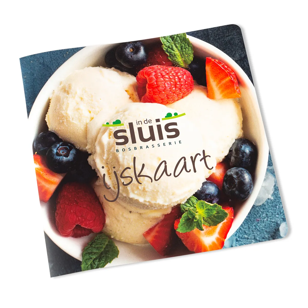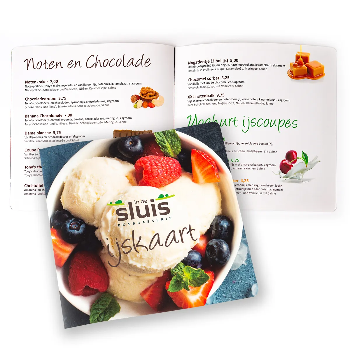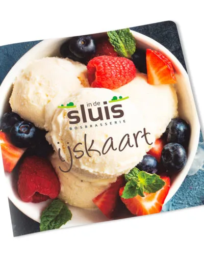 Hoe lekker ziet dit eruit? De nieuwe ijskaart voor ‘in de Sluis bosbrasserie’ in Well (Limburg) is klaar. En daar hebben we trek van gekregen, we gaan binnenkort eens een ijscoupe eten op met hun prachtige terras boven het water. Wij verzorgden ontwerp, opmaak en drukwerk van deze menukaarten.