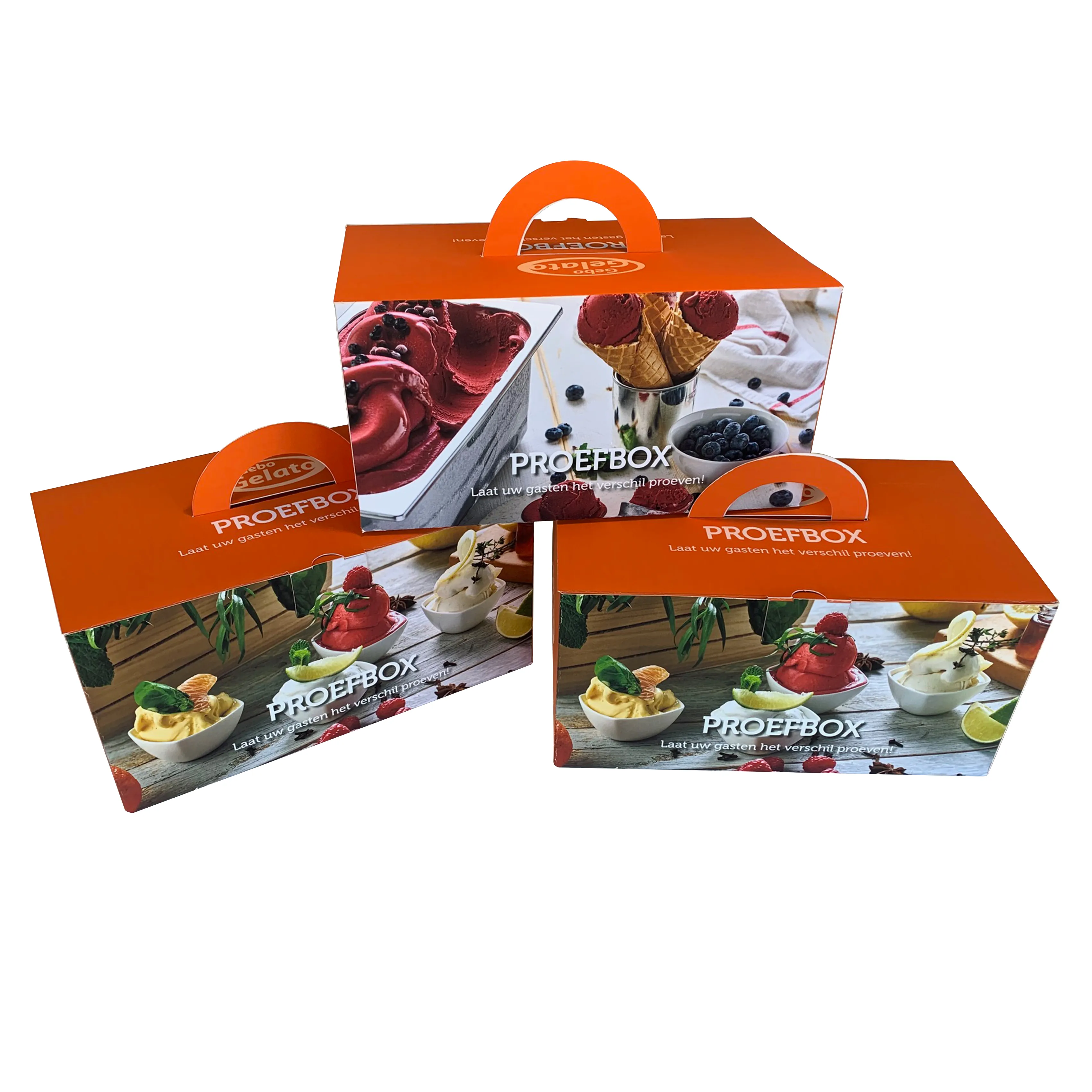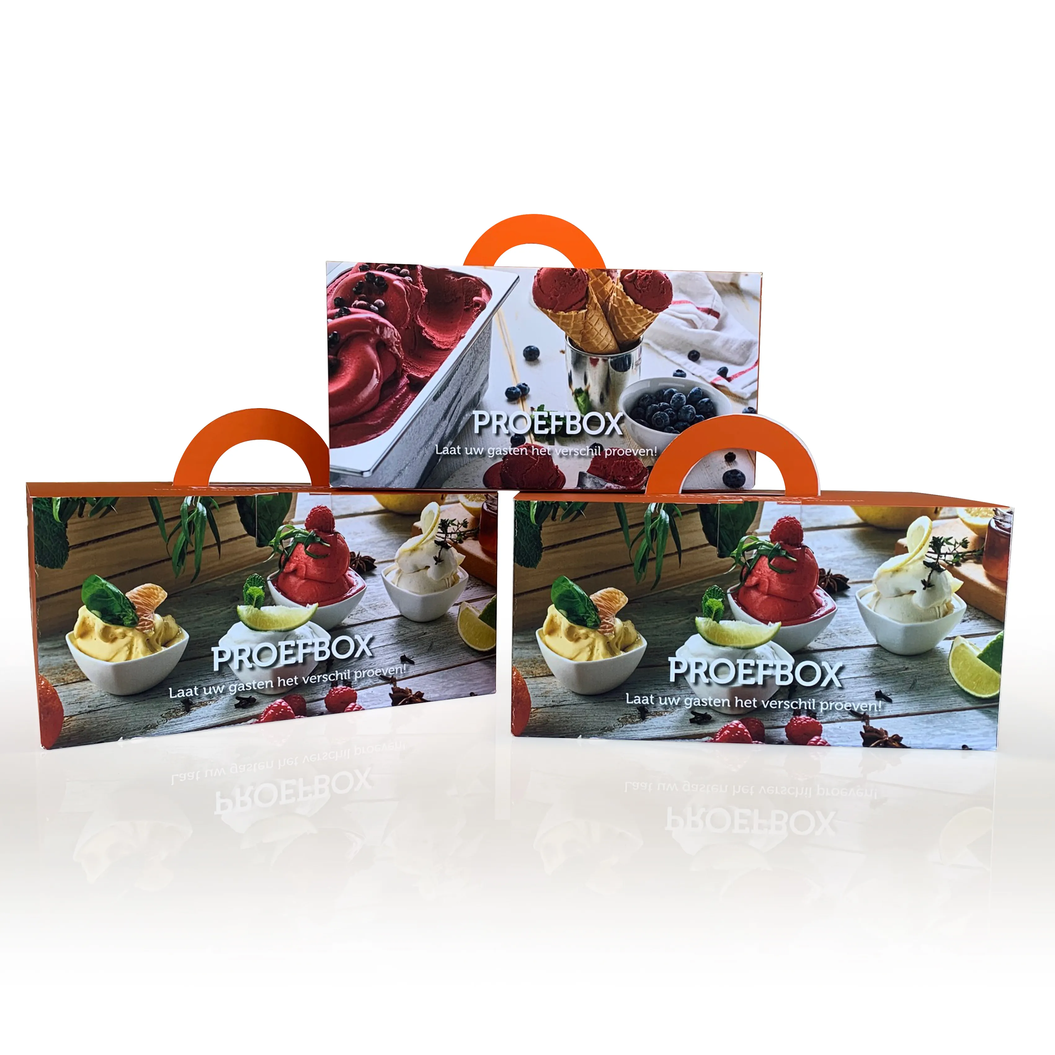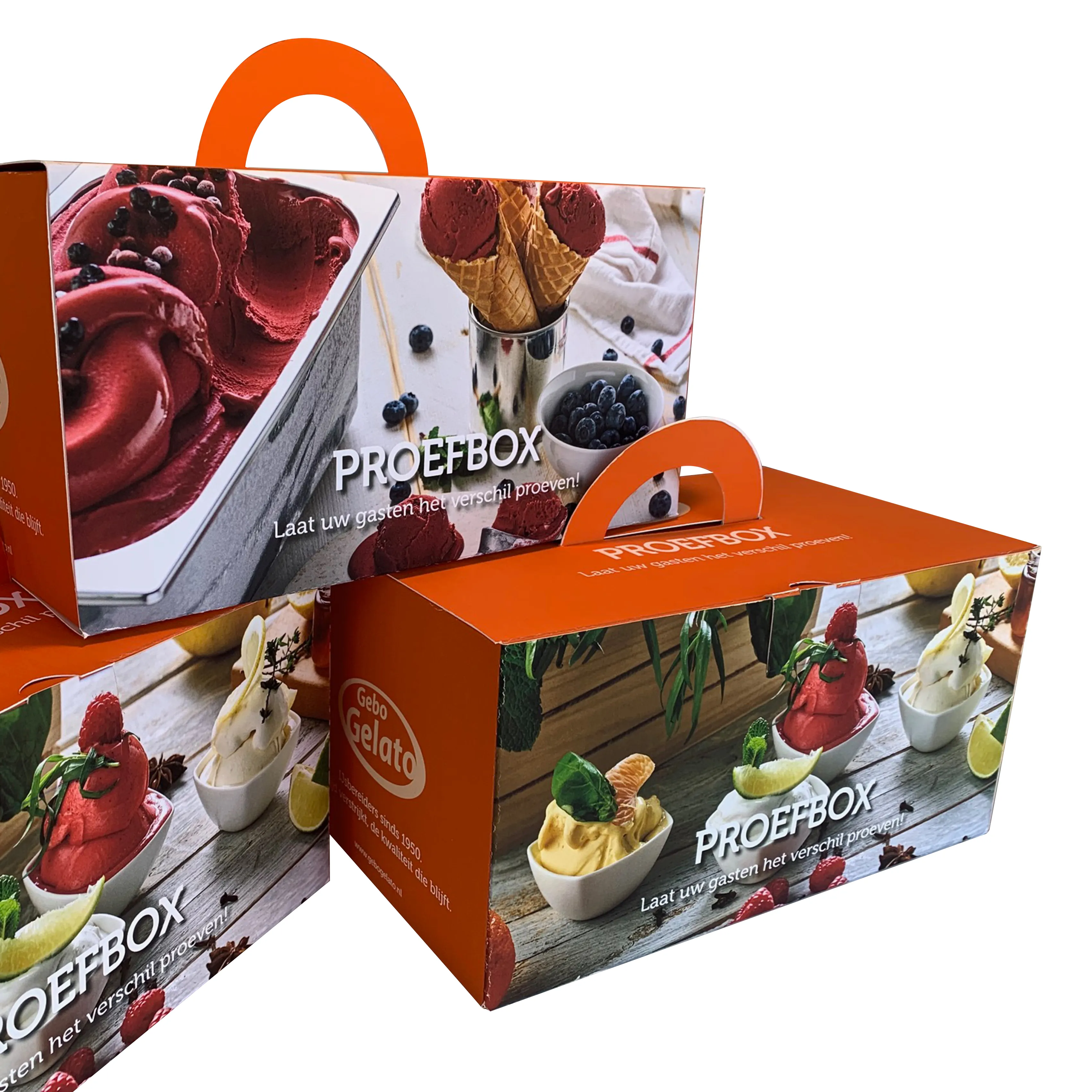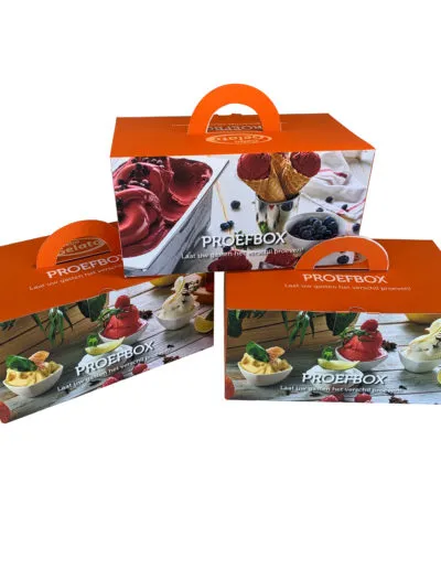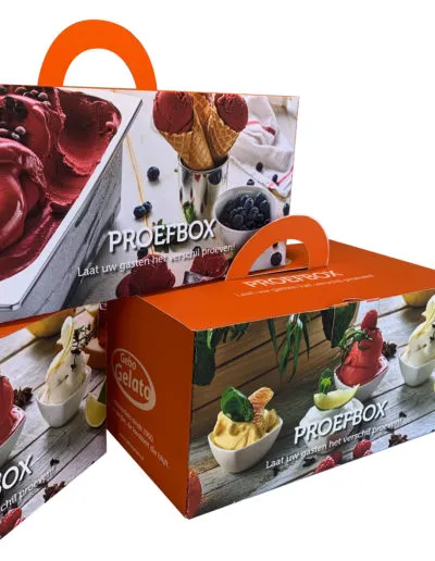 Voor een beurs wilde Gebo Gelato graag een 3-tal handmodellen van een PROEFBOX laten zien. Dit zijn nog dummy’s en deze worden in een later stadium verder uitgewerkt. Op onze grootformaat printer printen wij de vellen uit, plakken deze vervolgens op karton en snijden dan de doos uit volgens de stansvorm. Daarna is het in elkaar vouwen, plakken en klaar!